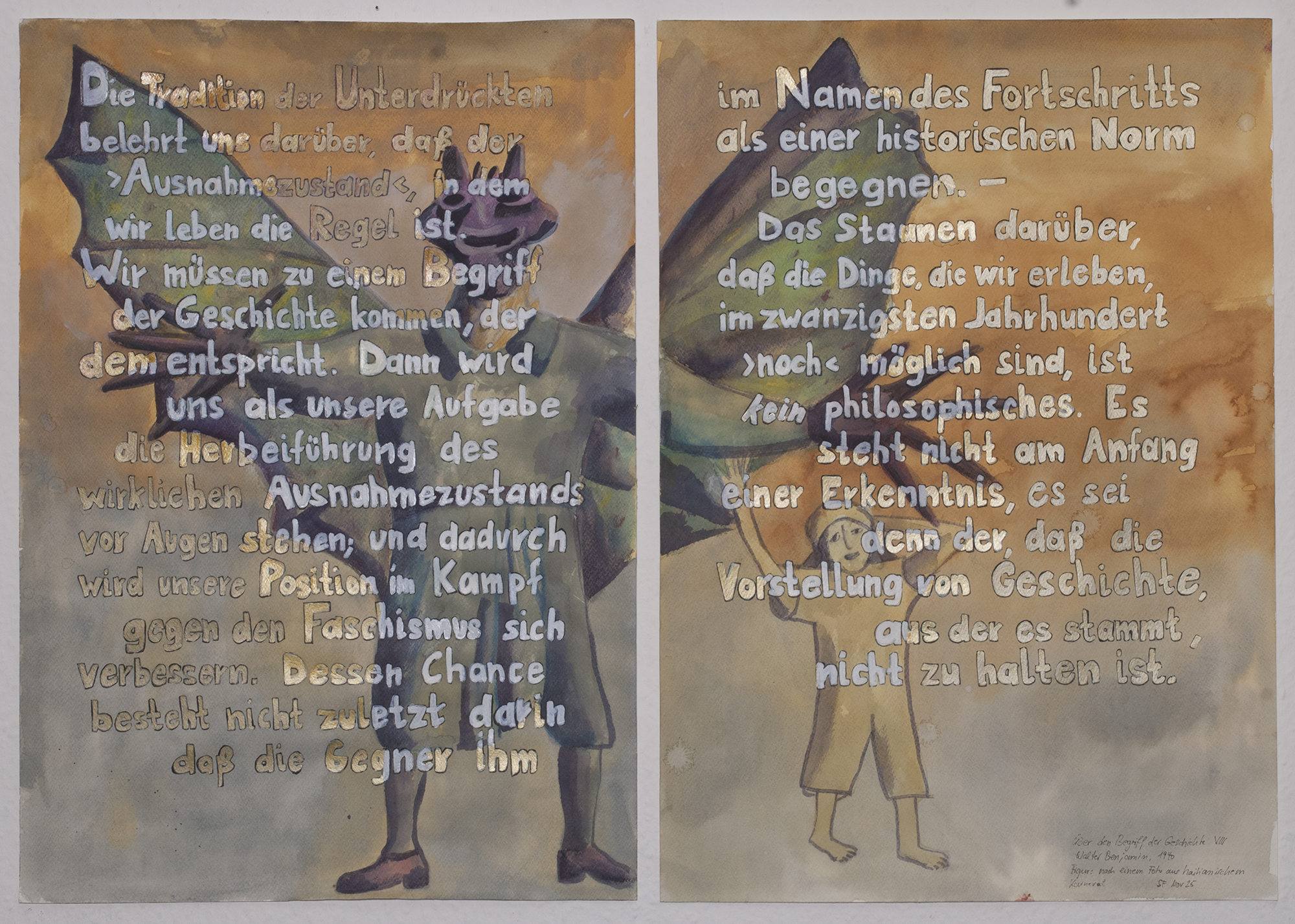 "Die Tradition der Unterdrückten belehrt uns darüber, daß der >Ausnahmezustand<, in dem wir leben, die Regel ist. Wir müssen zu einem Begriff der Geschichte kommen, der dem entspricht. Dann wird uns als unsere Aufgabe die Herbeiführung des wirklichen Ausnahmezustands vor Augen stehen; und dadurch wird unsere Position im Kampf gegen den Faschismus sich verbessern. Dessen Chance besteht nicht zuletzt darin, daß die Gegner ihm im Namen des Fortschritts als einer historischen Norm begegnen. - Das Staunen darüber, daß die Dinge, die wir erleben, im zwanzigsten Jahrhundert >noch< möglich sind, ist kein philosophisches. Es steht nicht am Anfang einer Erkenntnis, es sei denn der, daß die Vorstellung von Geschichte, aus der es stammt, nicht zu halten ist."
